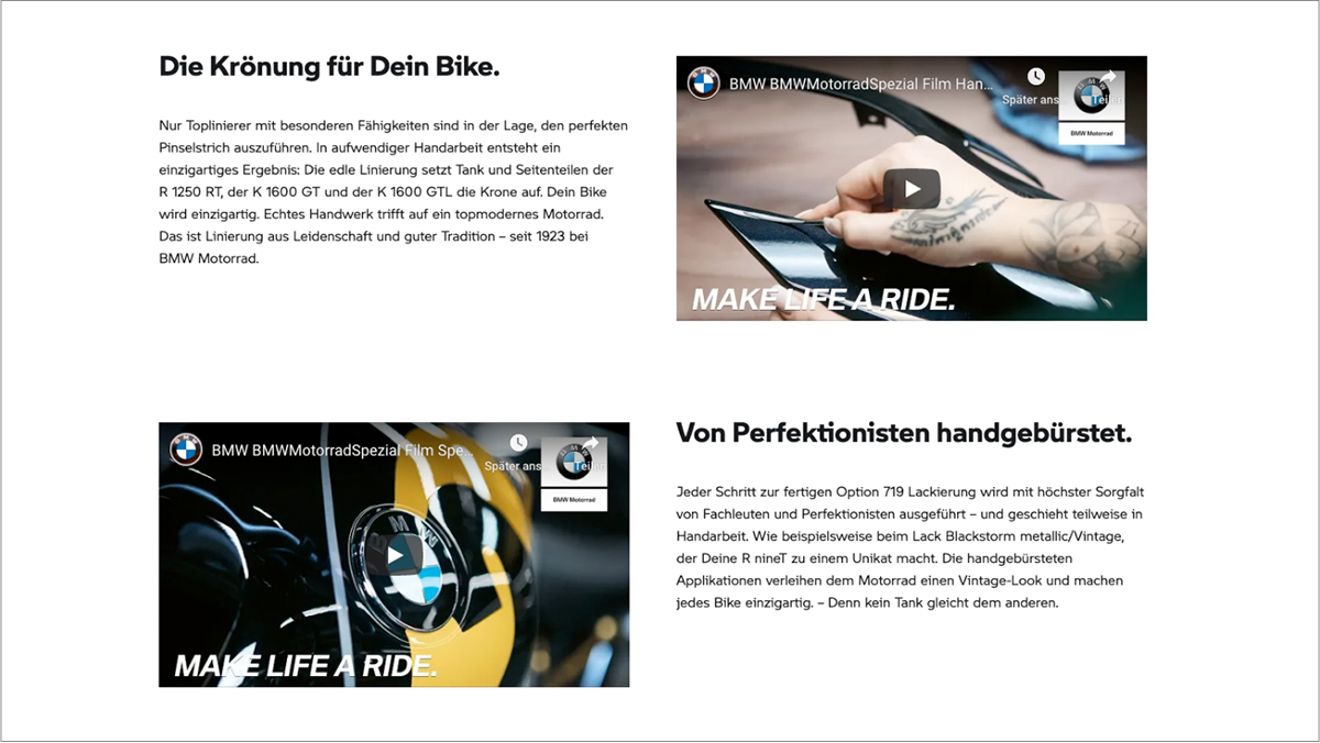 Fesselnde Stories und Events sollen das Produkt dem User emotional näherbringen. Wir verbinden so Marke, Produkt, Lifestyle und Cross-Selling gekonnt durch dynamische Inhalte. Das Versprechen “Make Life a Ride” steht immer im Fokus.